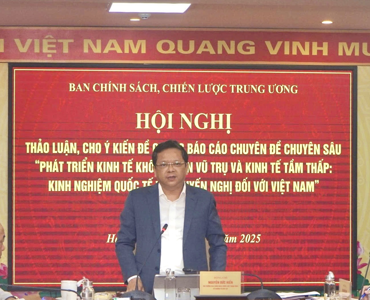 Phát biểu đề dẫn cho Phiên họp, đồng chí Nguyễn Đức Hiển nhấn mạnh phát triển kinh tế không gian vũ trụ và kinh tế tầm thấp là chủ đề mang tính thời sự, có ý nghĩa chiến lược lâu dài, gắn liền với sự phát triển khoa học – công nghệ, kinh tế – xã hội và an ninh – quốc phòng của đất nước trong bối cảnh mới. Phát triển kinh tế không gian vũ trụ và kinh tế tầm thấp đang dần trở thành một trụ cột quan trọng và có khả năng ứng dụng trong nhiều lĩnh vực như viễn thông, viễn thám, dự báo thời tiết và thiên tai, giám sát tài nguyên, quy hoạch đô thị, nông nghiệp thông minh, logistics,… Những chủ trương, chính sách gần đây (như Nghị quyết số 57-NQ/TW về đột phá khoa học công nghệ, đổi mới sáng tạo, chuyển đổi số quốc gia, Quyết định số 169/QĐ-TTg về Chiến lược phát triển và ứng dụng công nghệ vũ trụ đến năm 2030, và Quyết định số 1131/QĐ-TTg xác định công nghệ hàng không vũ trụ là một trong 11 công nghệ ưu tiên chiến lược) là nền tảng chính trị – pháp lý hết sức quan trọng để Việt Nam tiếp tục phát triển các lĩnh vực này. Chính bởi vậy, các thành viên Tổ Biên tập đều xác định cần thiết phải có chủ trương, định hướng, chiến lược phát triển tổng thể, dài hạn.