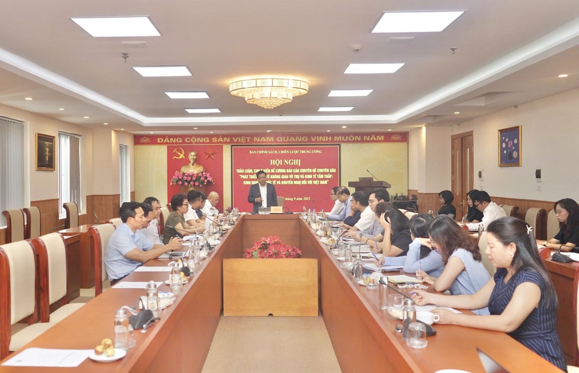 Ngày 12/9/2025, với vai trò là đơn vị đầu mối, thường trực giúp việc Tổ Biên tập, Viện Nghiên cứu Chính sách và Chiến lược tổ chức Phiên họp thứ nhất Tổ Biên tập xây dựng Báo cáo chuyên đề “Phát triển kinh tế không gian vũ trụ và kinh tế tầm thấp: Kinh nghiệm quốc tế và khuyến nghị đối với Việt Nam”. Đồng chí Nguyễn Đức Hiển, Phó Trưởng Ban Chính sách, chiến lược Trung ương, Tổ trưởng Tổ Biên tập chủ trì Phiên họp. Tham dự phiên họp có các thành viên Tổ Biên tập và một số tập đoàn, và nhóm nghiên cứu Viện Nghiên cứu Chính sách và Chiến lược.