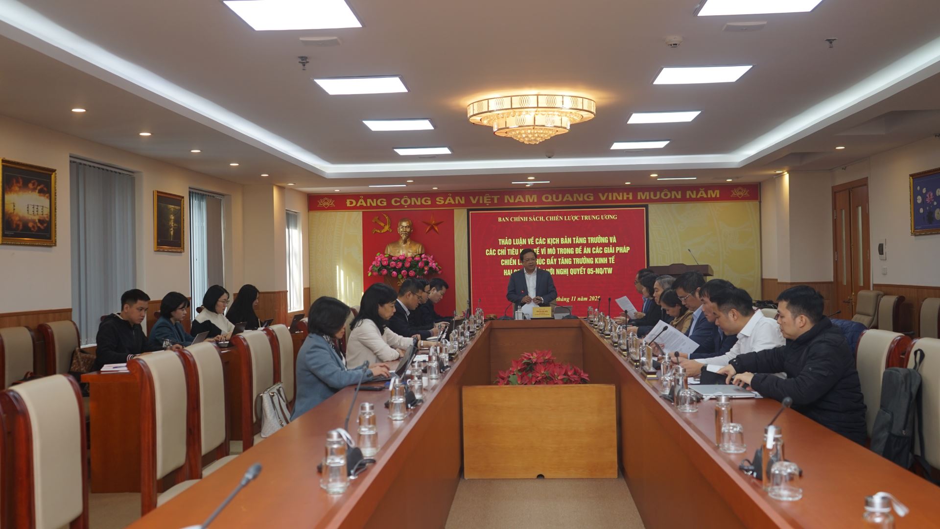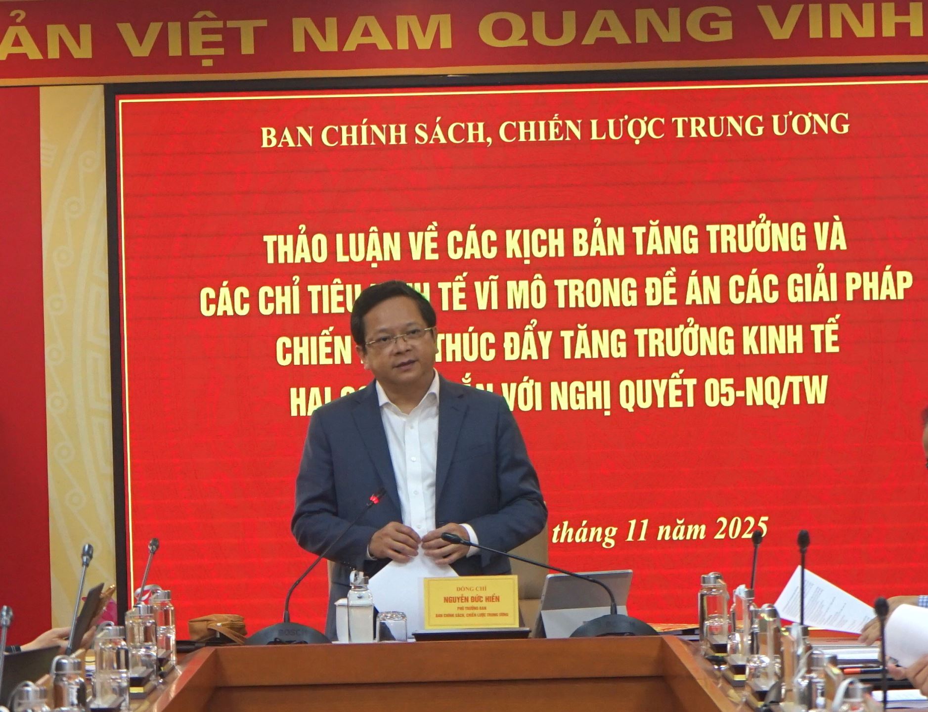 Chiều ngày 20/11/2025, tại Hà Nội, đồng chí Nguyễn Đức Hiển, Phó Trưởng Ban Chính sách, chiến lược Trung ương đã chủ trì buổi làm việc với Cục Thống kê, Bộ Tài chính do ông Lê Trung Hiếu - Phó Cục trưởng làm Trưởng đoàn cùng đại diện lãnh đạo các đơn vị của Cục Thống kê. Tham gia buổi làm việc có đồng chí Đặng Đức Anh, Phó Viện trưởng Viện Nghiên cứu Chính sách và Chiến lược (IPSS) và đại diện một số phòng chuyên môn của Viện. Nội dung buổi làm việc nhằm thảo luận về các kịch bản tăng trưởng và các chỉ tiêu kinh tế vĩ mô trong Đề án Các giải pháp chiến lược thúc đẩy tăng trưởng kinh tế hai con số gắn với Nghị quyết 05-NQ/TW của Ban chấp hành Trung ương Đảng khóa XII, ngày 01/11/2016.