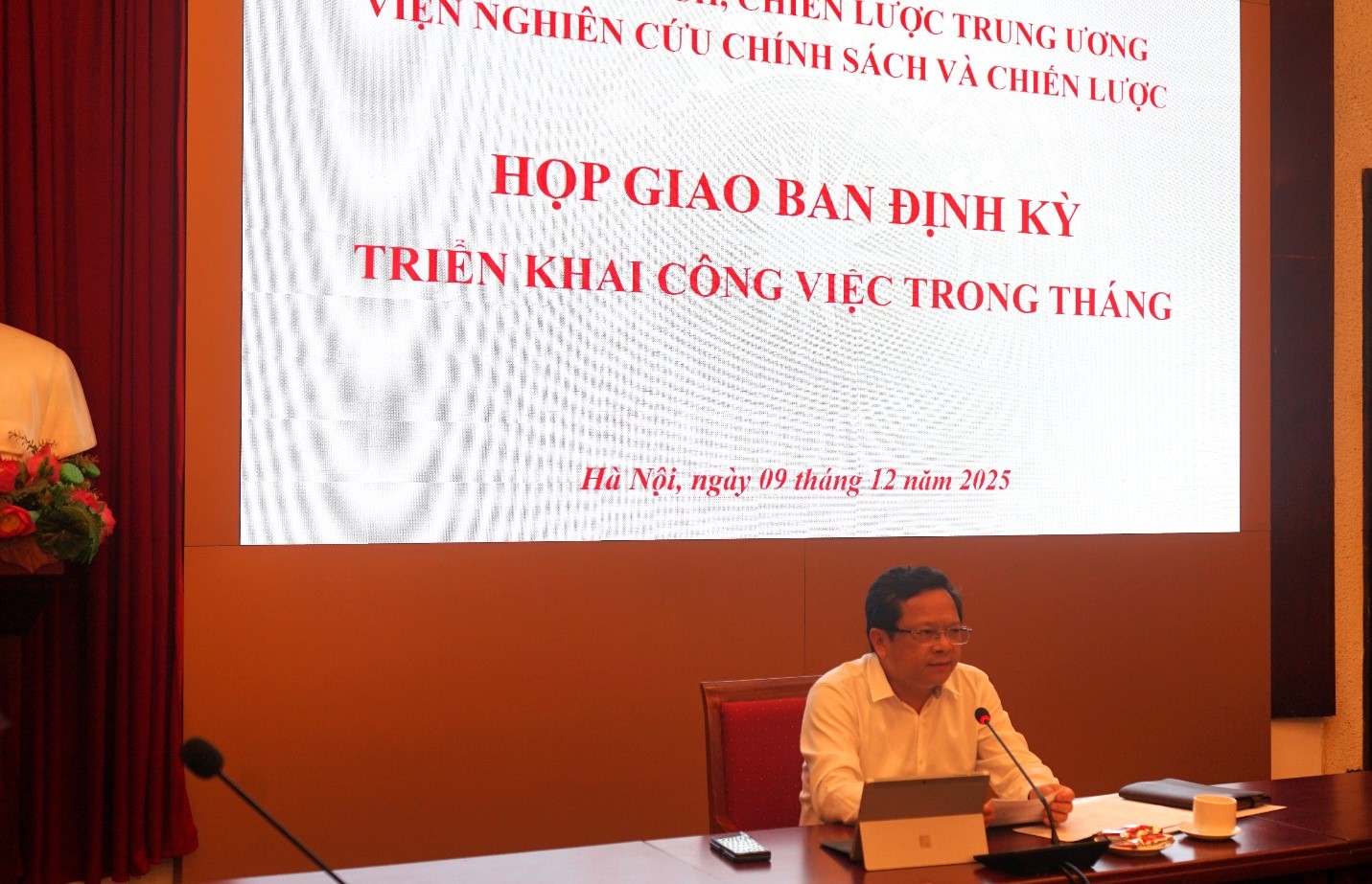 Chiều ngày 09/12/2025, Viện Nghiên cứu Chính sách và Chiến lược (IPSS) đã tổ chức cuộc họp giao ban định kỳ nhằm đánh giá kết quả công tác tháng 11 và triển khai nhiệm vụ trọng tâm trong tháng 12. Đồng chí Nguyễn Đức Hiển, Phó Trưởng Ban Chính sách, chiến lược Trung ương chủ trì cuộc họp. Cuộc họp có sự tham dự của các đồng chí Lãnh đạo Viện, lãnh đạo các phòng cùng toàn thể viên chức và người lao động.