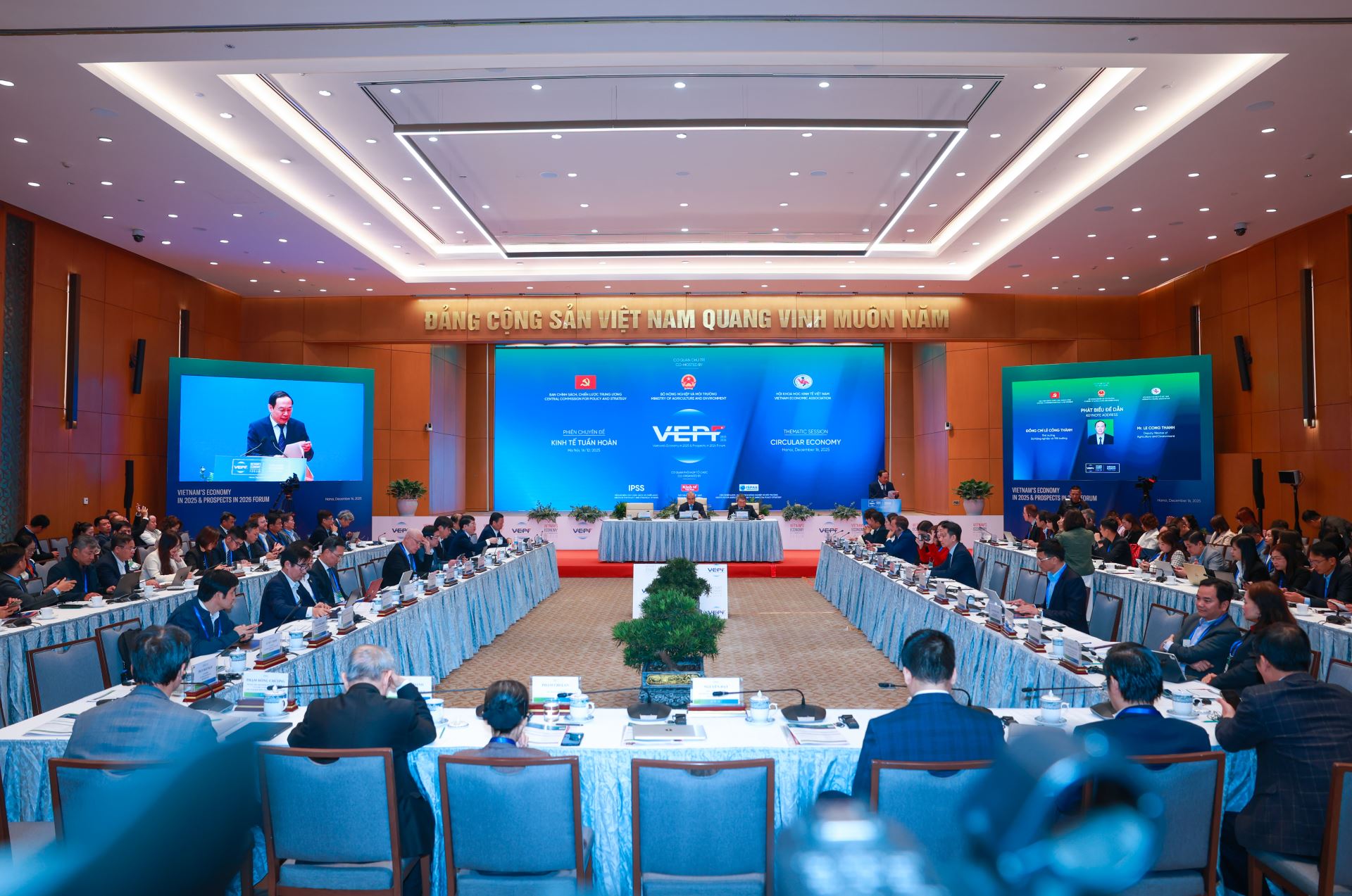 Phiên Chuyên đề 2 về kinh tế tuần hoàn với chủ đề “Kinh tế tuần hoàn Việt Nam 2025 - Thúc đẩy mạnh mẽ chuyển đổi xanh, phát triển kinh tế tuần hoàn trong kỷ nguyên số để hiện thực hóa mục tiêu tăng trưởng "2 con số" giai đoạn 2026–2030” do Ban Chính sách, chiến lược Trung ương; Bộ Nông nghiệp và Môi trường và Hội Khoa học Kinh tế Việt Nam tổ chức dưới sự chủ trì của các đồng chí: Phạm Đại Dương, Uỷ viên BCH Trung ương Đảng, Phó Trưởng Ban Chính sách, chiến lược Trung ương; Lê Công Thành, Thứ trưởng Bộ Nông nghiệp và Môi trường; Bùi Quang Tuấn, Phó Chủ tịch Hội Khoa học Kinh tế Việt Nam. Phiên chuyên đề tập trung vào việc phản ánh thực tiễn hoạt động ứng dụng mô hình kinh tế tuần hoàn trong các ngành, lĩnh vực kinh tế; xác định và đánh giá các điểm lợi thế trong quá trình thực thi chuyển đổi xanh, ứng dụng kinh tế tuần hoàn cũng như các rào cản về chính sách, nguồn lực, năng lực quản trị và thực thi ứng dụng mô hình thông qua việc chia sẻ kinh nghiệm thực tiễn triển khai của các tập đoàn, doanh nghiệp và địa phương.