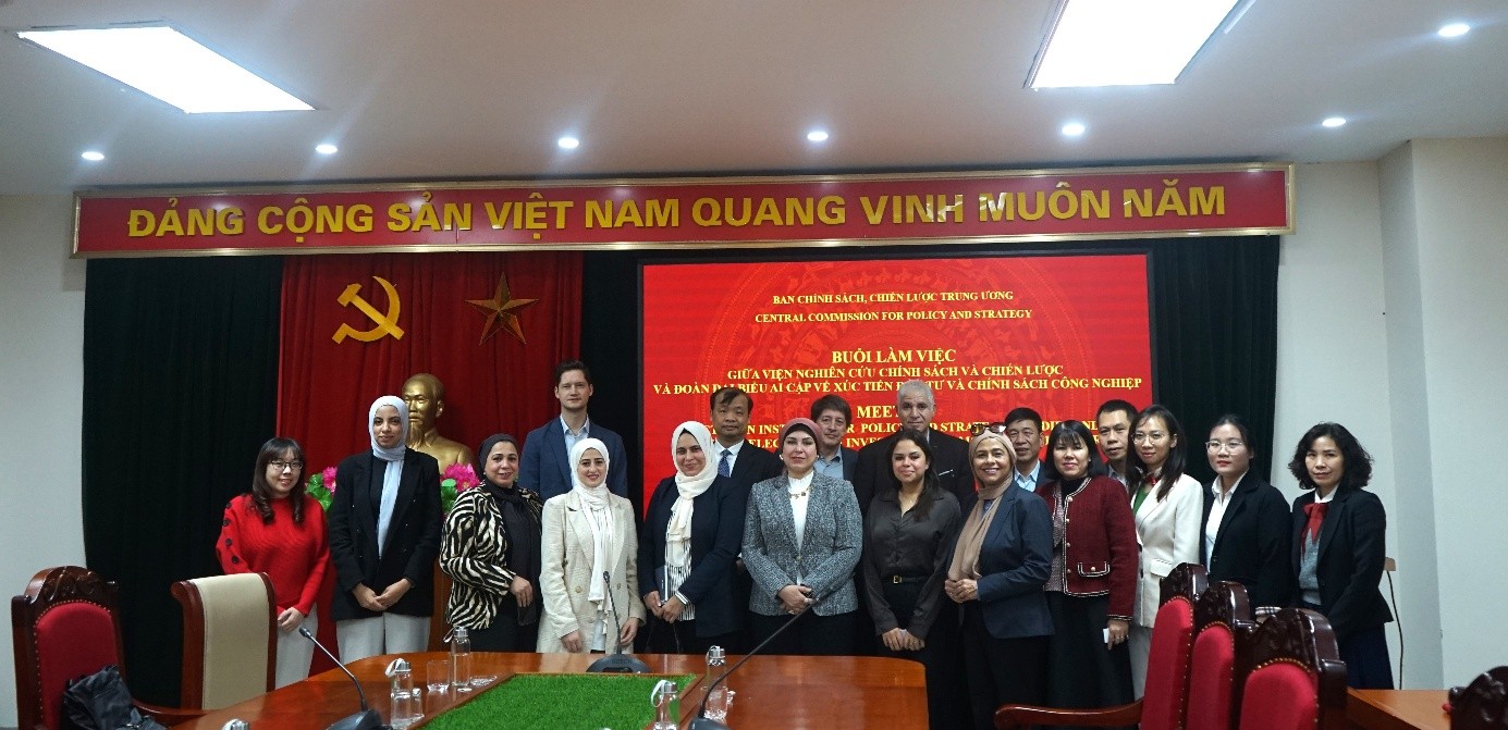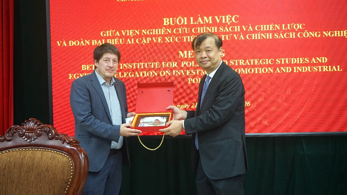 Sáng ngày 21/01/2026, tại Hà Nội, đồng chí Nguyễn Hoa Cương, Phó Viện trưởng Viện Nghiên cứu Chính sách và Chiến lược, Ban Chính sách, chiến lược Trung ương đã chủ trì tiếp và làm việc với đại diện của Tổ chức Phát triển Công nghiệp Liên Hợp Quốc (UNIDO) và đoàn đại biểu Ai Cập sang khảo sát, học tập kinh nghiệm tại Việt Nam. Đoàn công tác do ông Anders Isaksson, Trưởng ban Tư vấn chính sách công nghiệp và phát triển năng lực, Trụ sở chính UNIDO làm Trưởng đoàn. Tham gia buổi làm việc có đại diện lãnh đạo và các phòng chuyên môn của Viện. Cuộc họp tập trung vào việc chia sẻ kinh nghiệm của Việt Nam trong xây dựng chính sách công nghiệp và thu hút đầu tư trực tiếp nước ngoài (FDI).