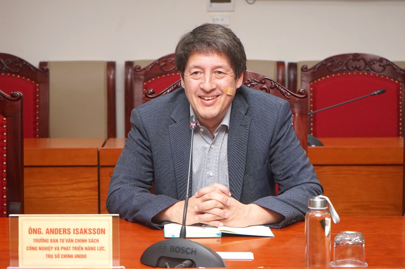 Ông Anders Isaksson, Trưởng ban Tư vấn chính sách công nghiệp và phát triển năng lực, Trụ sở chính UNIDO phát biểu