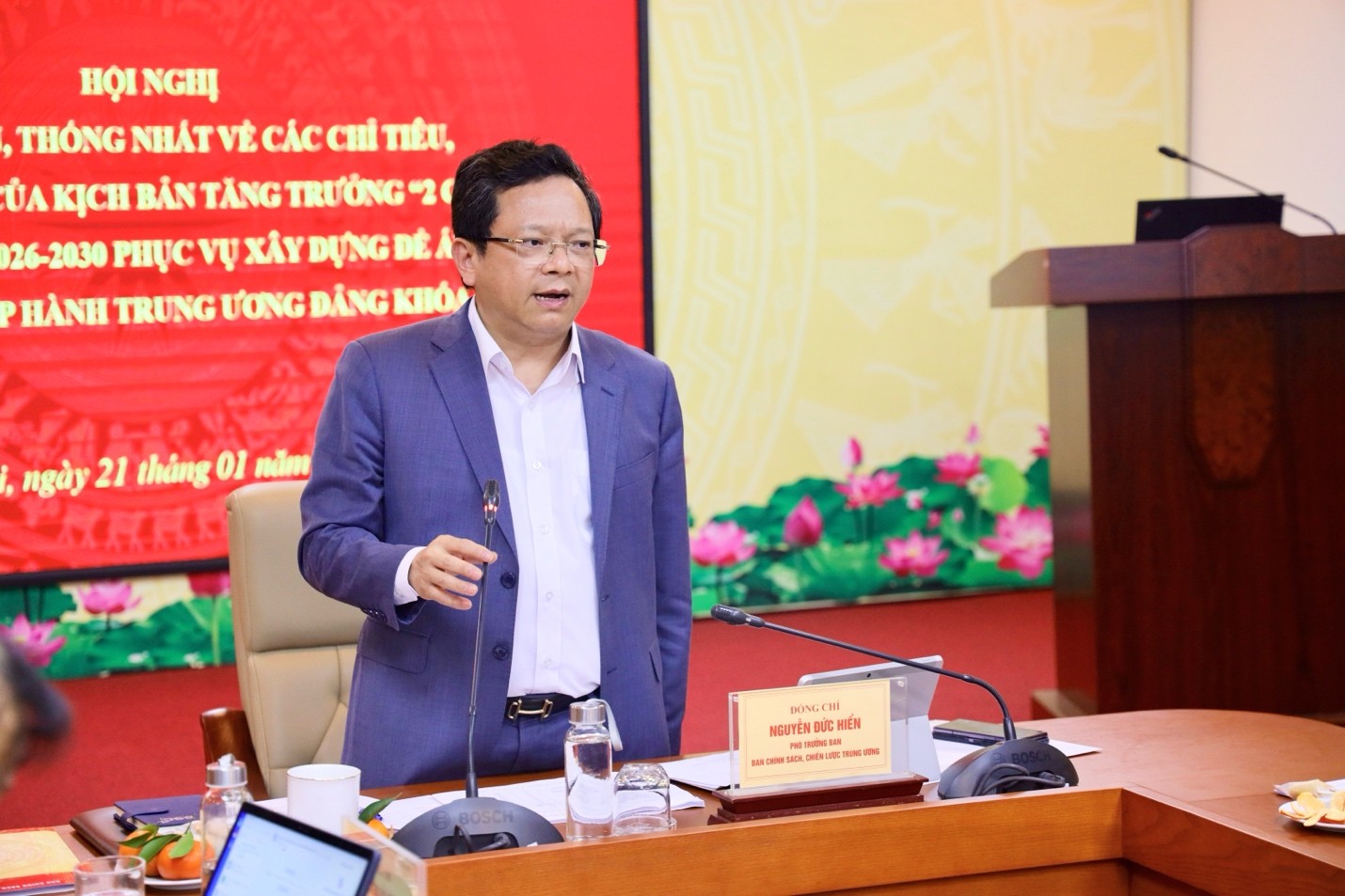 Chiều ngày 21/01/2026, tại trụ sở Ban Chính sách, chiến lược Trung ương, Thường trực Ban Chỉ đạo, Tổ Biên tập xây dựng Đề án “Các giải pháp chiến lược thúc đẩy tăng trưởng kinh tế “hai con số” trong kỷ nguyên mới – kỷ nguyên vươn mình của dân tộc Việt Nam gắn với Tổng kết Nghị quyết số 05-NQ/TW ngày 01/11/2016 của Ban Chấp hành Trung ương Đảng khóa XII” tổ chức Hội nghị với các bộ, ngành để thảo luận, thống nhất về các chỉ tiêu, số liệu chủ yếu của kịch bản tăng trưởng “2 con số” giai đoạn 2026-2030 phục vụ xây dựng Đề án trình BCH Trung ương Đảng Khóa XIV. Đồng chí Nguyễn Đức Hiển, Phó Trưởng Ban Chính sách, chiến lược Trung ương; Phó Trưởng Ban Thường trực Ban Chỉ đạo kiêm Tổ trưởng Tổ Biên tập chủ trì buổi làm việc. Tham dự buổi làm việc có các đồng chí đại diện một số bộ, ngành liên quan cùng thành viên Tổ Biên tập.